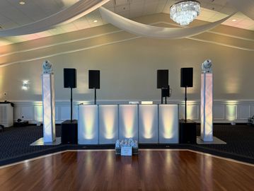 Our dazzling, state-of-the-art intelligent lighting can be added to any package. These multi-effect 360 moving head fixtures are displayed on 4 foot or 7 foot trussing totems. You can choose to have your totems wrapped in white or unwrapped for an industrial aluminum look. We can illuminate your totems in the color of your choice.